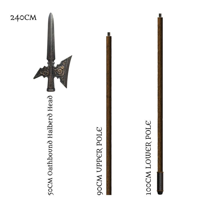 Este tipo de alabarda se inspira en el diseño de las armas de asta estandarizadas de la Europa de finales de la Edad Media y principios del Renacimiento. La alabarda juramentada encarna el espíritu de los guerreros que cumplen su deber. En una época en la que la lealtad definía el valor de un soldado, a quienes portaban tales armas se les confiaba la protección de las ciudades, la defensa de los estandartes y la defensa del muro de escudos sin retirada. Ya sea portada por guardias reales, centinelas de la ciudad, guardas fronterizos, sirvientes jurados u oficiales curtidos en la batalla, la Alabarda Jurada se adapta a la perfección a una amplia gama de representaciones de personajes.