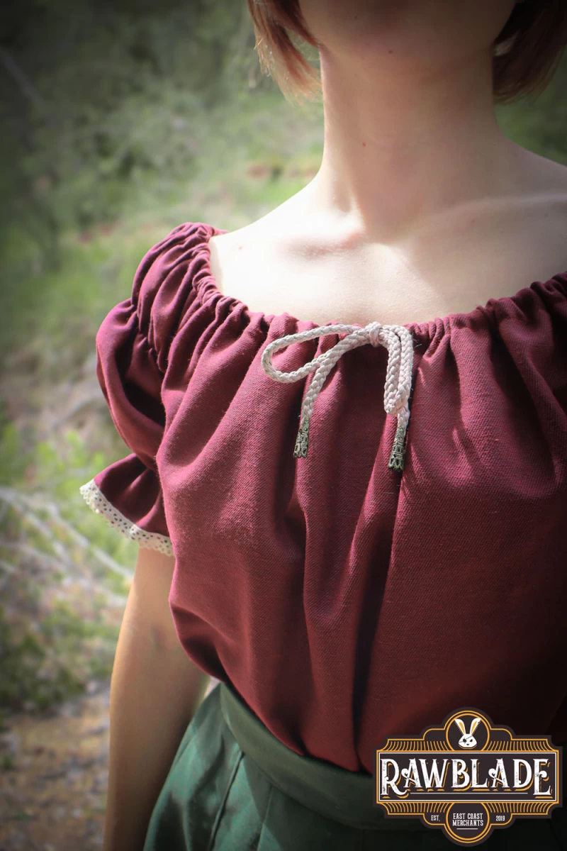 La blusa Emma de Rawblade es una prenda esencial, romántica y de inspiración fantasiosa, confeccionada en España. Diseñada para ferias de Renania, cosplay y eventos de fantasía, esta versátil blusa combina un encanto rústico con detalles refinados. Confeccionada en una mezcla transpirable de algodón y poliéster, presenta mangas abullonadas con un delicado ribete de encaje, un escote redondo con lazo ajustable y una silueta suave que favorece a todo tipo de cuerpos.