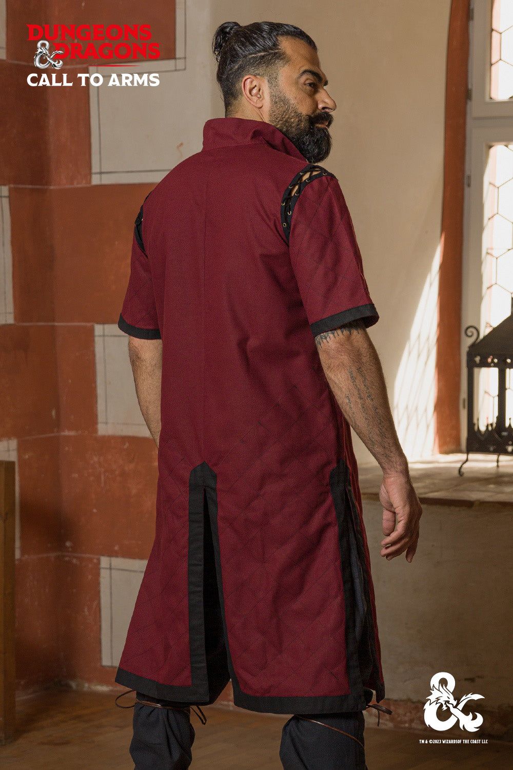 La túnica de luchador de D&D se puede usar sola o debajo de la armadura, lo que la hace perfecta para todo tipo de guerreros. Esta túnica distintiva presenta un cuello alto con una abertura en el centro delantero. Sus mangas cortas acolchadas tienen colores contrastantes en los dobladillos para un toque estilístico adicional. La túnica llega más allá de las rodillas para una cobertura completa. Sus aberturas laterales permiten una máxima movilidad, y la túnica se puede usar debajo de la armadura o sola para adaptarse a una variedad de conceptos de personajes.